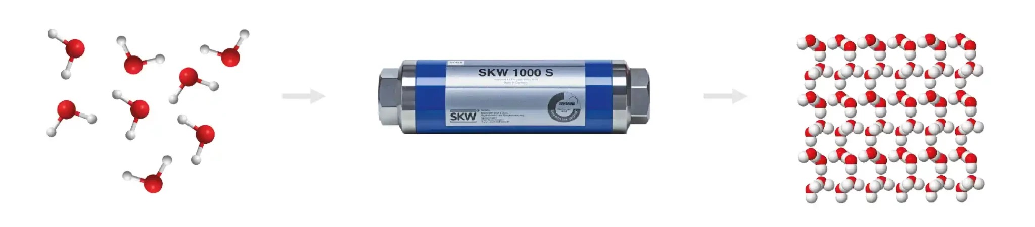 Water passes through powerful permanent magnets built into the SKW® unit. No power needed, the water flow creates the treatment effect naturally.