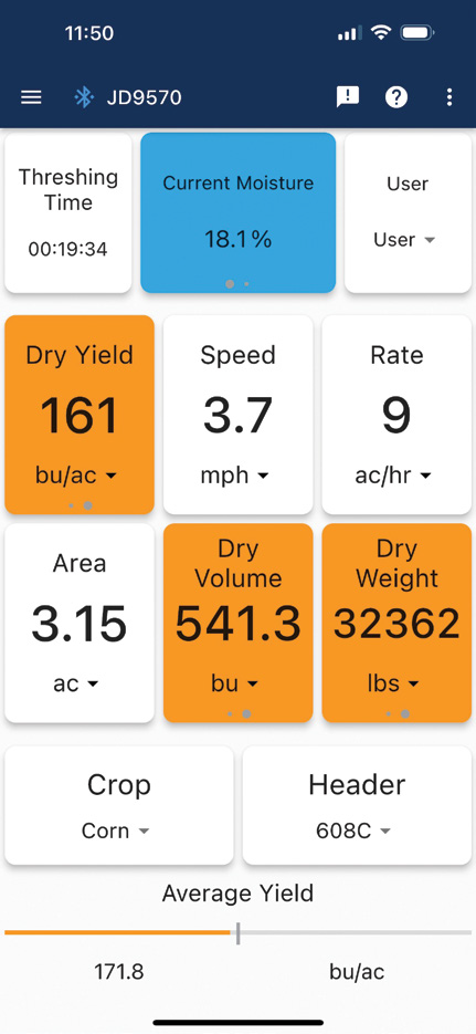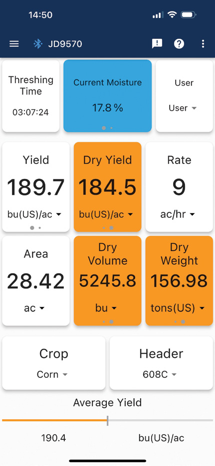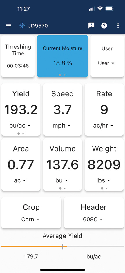 - Swipeable Live Data Tiles - Switch between yield, moisture, speed, area with simple swipe gestures